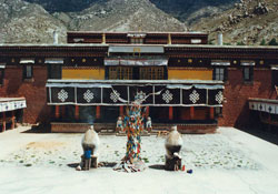 Nechung monastery in Tibet lies just below Drepung monastery, four miles west of Lhasa, the country's capital. Nechung originally came to Tibet with a descendant of the Indian sage Dharmapala. During the reign of King Tri-Song Deu-Tsan in the eighth century AD, he was appointed protector of Samye monastery by the Indian saint and tantric master Padmasambhava. At that time, Samye, Tibet's first monastic institute, was known as Nechen (the larger site) and Nechung (the smaller site).